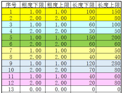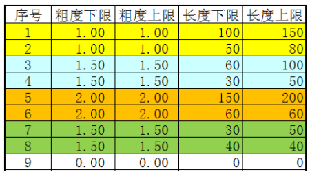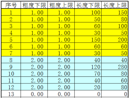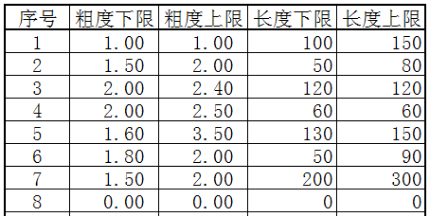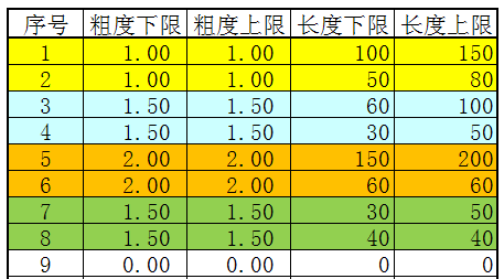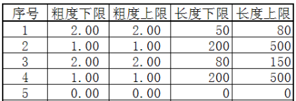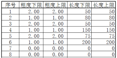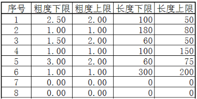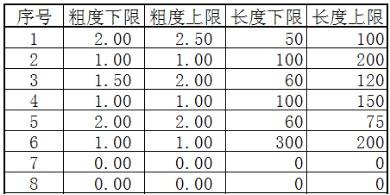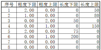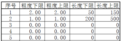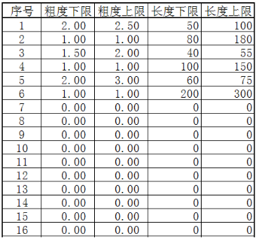 E、点击“粗度上下限一致”按钮,则会把所有的粗度下限数值自动复制到粗度上限中去;点击“长度上下限一致”按钮,则会把所有的长度下限数值自动复制到长度上限中去。