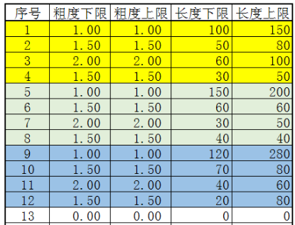 根据无规律模式下大组划分规则,第5、9小组的粗度上下限数值和第1小组的粗度上下限数值完全一致,所以第5小组为第二大组的起点,第9小组为第三大组的起点。因此,第1、2、3、4小组为第一大组,第5、6、7、8小组为第二大组,第9、10、11、12小组为第三大组。