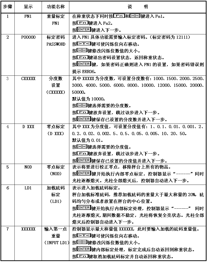 电子秤称重不准确或更换称重传感器则需对电子秤校准,校准时只需进行第1、2、5、6、7步操作。