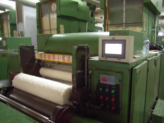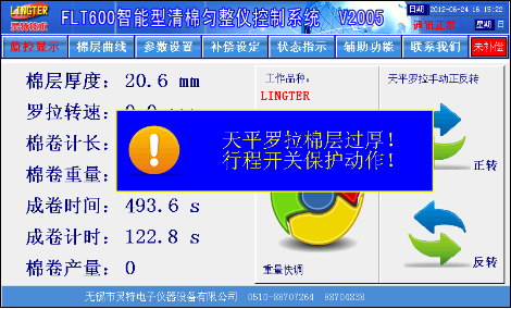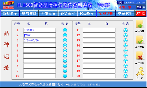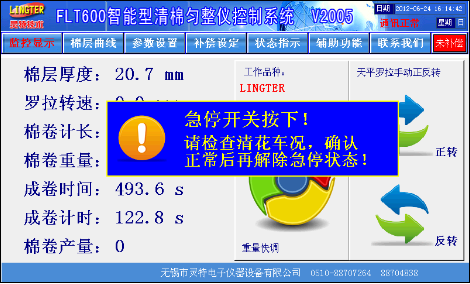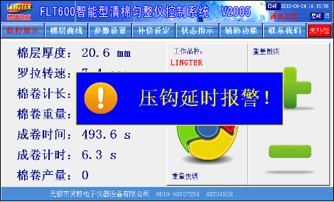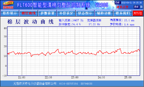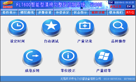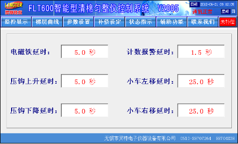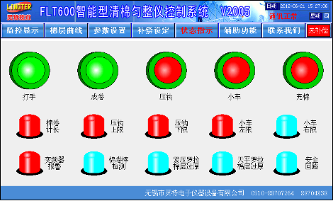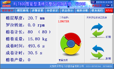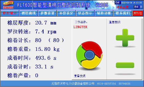 触摸屏画面精美,所有数据一目了然,设定方便,更有棉层厚度波动记录功能、自动调试功能、曲线补偿功能、品种储存功能、棉卷产量统计功能、车况状态显示功能。基本画面如图1: