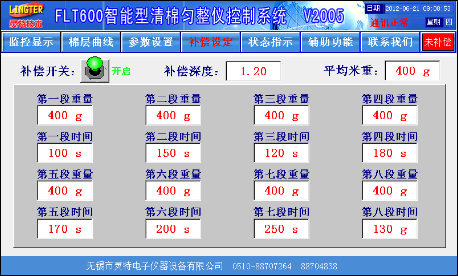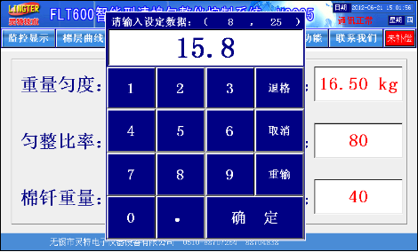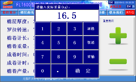 通过键盘,直接输入棉卷的实际重量,然后按“确定”按钮,就可快速调整棉卷的重量,生产出来的下一个棉卷即达到标准重量。