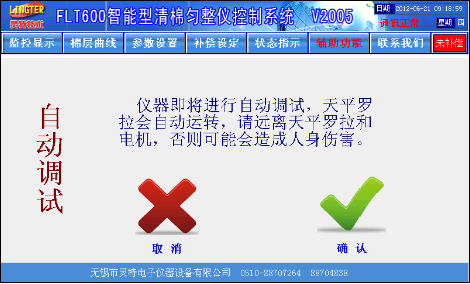 自动调试:点击该按钮后,进入到自动调试画面,如图11所示。再点击“确认”键后,仪器会自动运转,并进行一些调试、校正和初始化工作,如遇传感器安装位置不合适,自动停止,并文字提示,根据所提示的内容进行一些调整后,继续尚未完成的自动调试工作。
