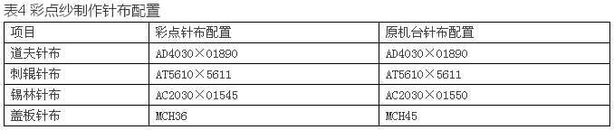 彩点纱针布配置既要保证能够将基纱纤维的棉结梳开,同时也要减弱对彩点的梳理,以免影响布面和彩点的效果。道夫针布的主要作用是抓取凝聚纤维,影响道夫针布转移作用的因素主要有锡林针布规格、锡林速度、锡林与道夫间隔距及道夫针布齿形。合理选择道夫工作角也很重要,工作角小,纤维转移率高,锡林与盖板针布负荷小,棉结少,但工作角过小,会使转移率过高,纤维受到的梳理次数减少,混和作用差,棉网可能出现云斑。反之,工作角过大,梳理作用下降,棉结增多。选配中,掌握“锡林梳理齿密偏大、盖板齿密偏稀、梳理转移相互结合“的针布配置原则,彩点纱针布配置见表4。