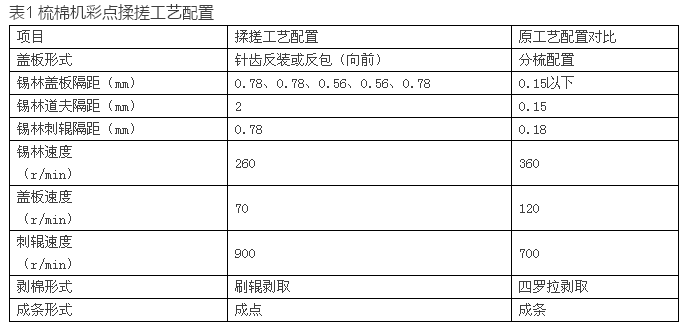 制作彩点纱的梳棉机盖板针布要调成反向配置,非分梳配置;目的是增加对纤维的控制能力,为反复揉搓提供条件。相互梳理配置要求见表2。