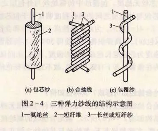 氨纶弹力纤维与其他纤维混合纺成弹力纱,其纱线的形式目前有三种形式:即氨纶包芯纱、氨纶合捻纱和氨纶包覆纱。三种形式的纱线在加工原理、结构性能上有着本质的区别。因此其用途和织造性能也有很大的差别。三种纱线的结构示意图如图2-4所示。